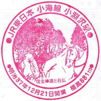 小淵沢駅 2025.11.02 収集日 2010年2月 収集した人 W 所在地 山梨県/JR_小海線 ジャンル 鉄道 スタンプの色 赤系 スタンプの形状 丸 関連するスタンプ 小淵沢駅(2) 小淵沢駅(3) 所在地欄にある路線名はスタンプに記載がある場合はその路線名を、スタンプに記載がない場合は乗り入れ路線名を書いています。